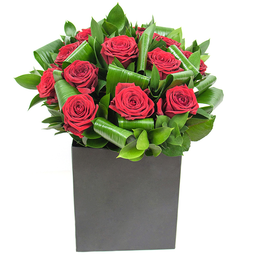 Adorn your home with our sophisticated bouquet, featuring vibrant red roses, lush aspidistra foliage, and elegant ruscus stems. Each bloom is meticulously selected to ensure top-notch quality and enduring freshness.